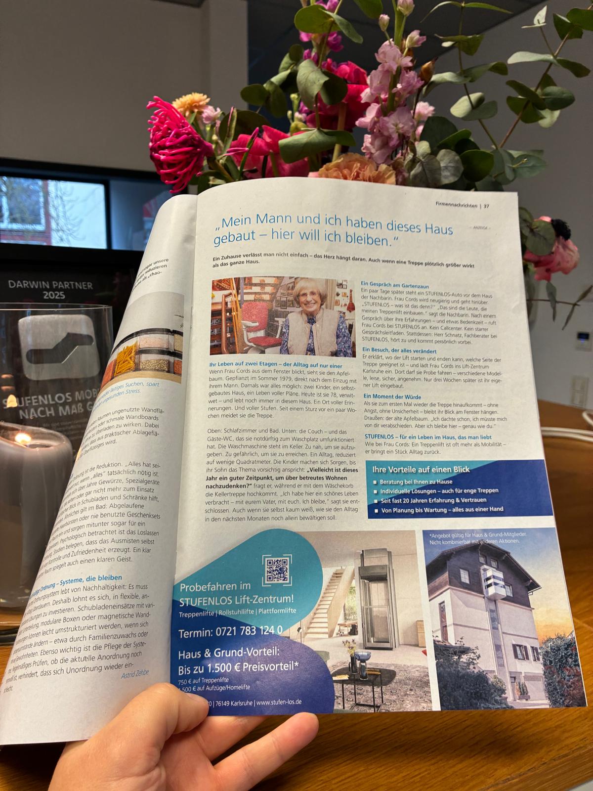 Er nimmt sich Zeit, hört zu, erklärt die Möglichkeiten und lädt sie ins Lift-Zentrum Karlsruhe ein. Dort kann sie verschiedene Modelle ausprobieren – in Ruhe, ohne Verkaufsdruck. Drei Wochen später ist der Lift eingebaut.